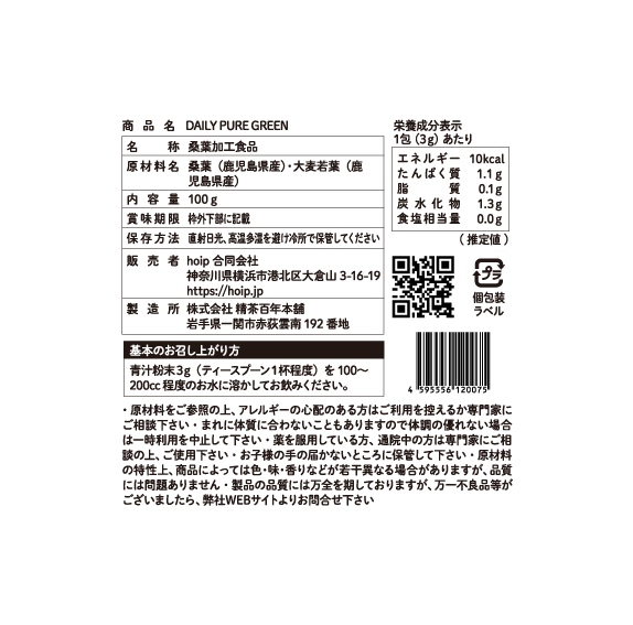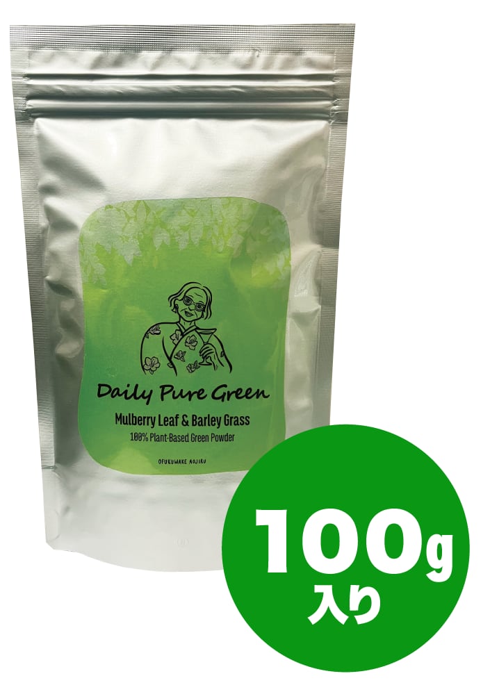 有機桑葉と大麦若葉2種類の原材料のみで作ったシンプルな青汁 Daily Pure Green 100g入りです。