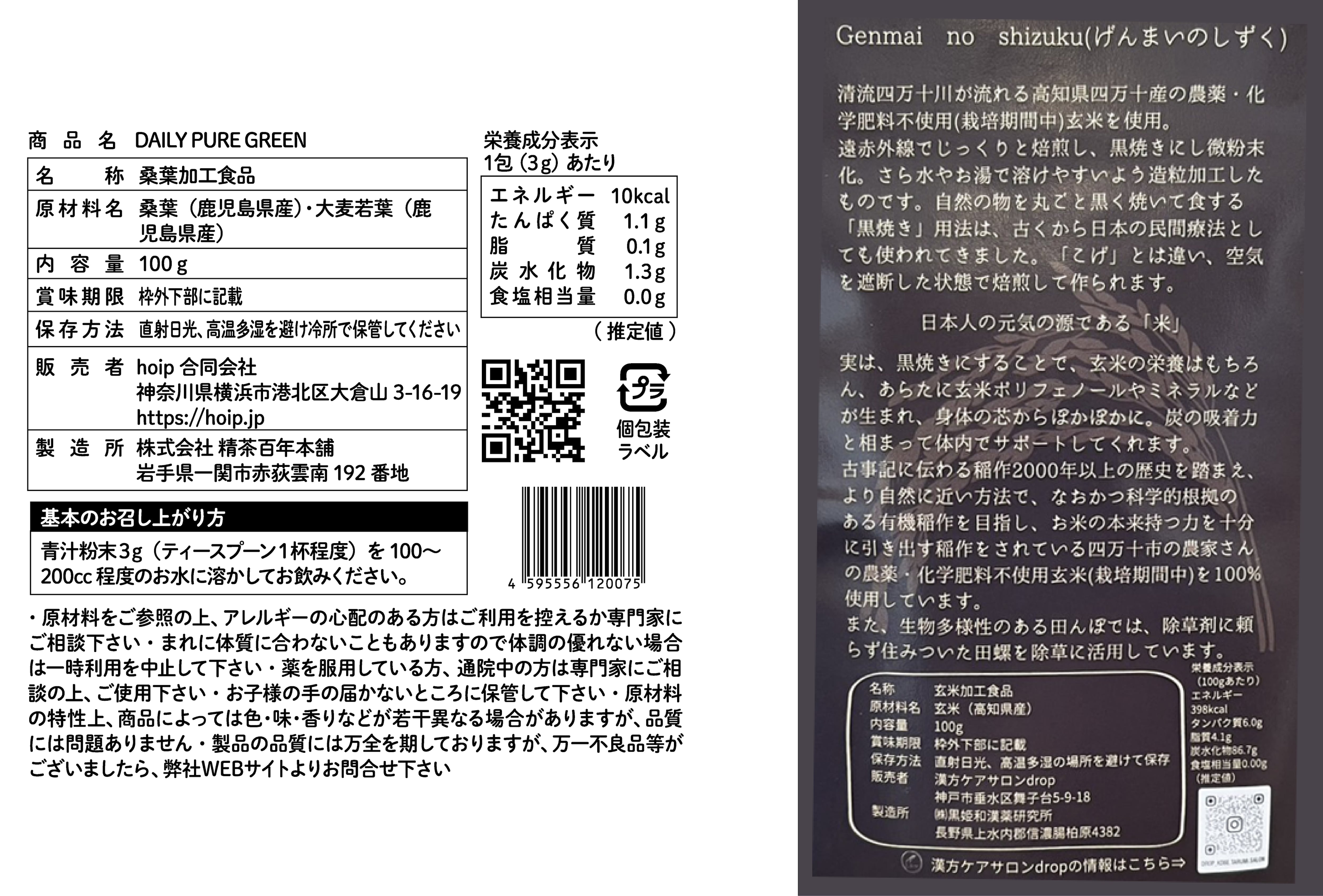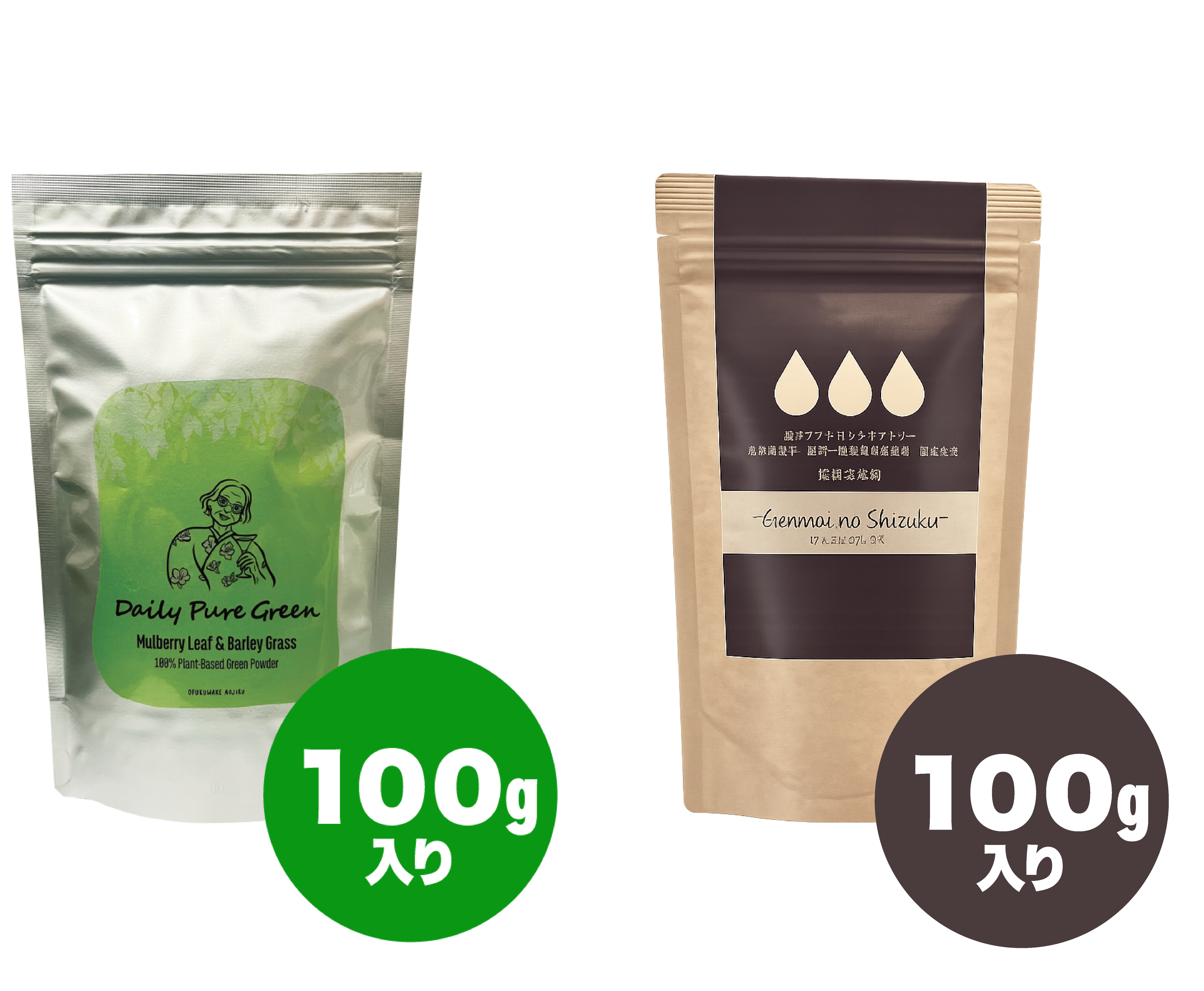 げんまいのしずく と Daily pure green (ヴィーガン向け青汁) 100g入 1袋ずつのセット販売です。